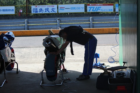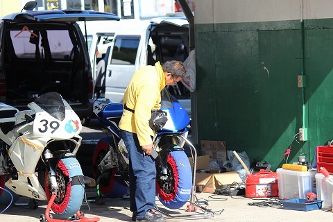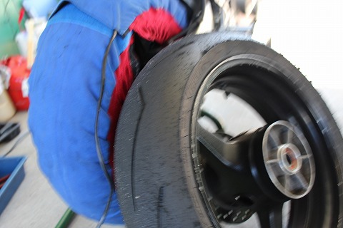 8:00 いの一番に パドックに到着して、まずはハイエースからバイクを下ろす。 一般公道用のタイヤと違って、タイヤウォーマーを使って暖めないと性能が出ないので、いの一番にタイヤのエアーをチェックして、ウォーマーをかけておきます。 |