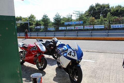 8:40 コースオープン 8時40分になって、コースオープンになりました。 普通の公道用のタイヤを履いた連中はコースインの準備をしています。 自分はまだまだ、タイヤを暖め中。 |