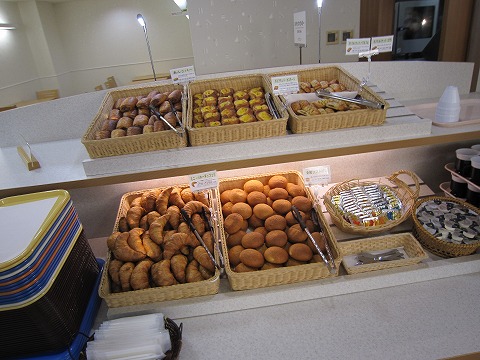 6:33 ロビーへ 出発する荷物をまとめ、朝食がスタートする6時半になってロビーに下りて、軽食コーナーへ。 焼きたてのパンが何種類か並んでいて、無料の自販機で飲物。 自分で好きなのを好きなだけ取って朝食。 |