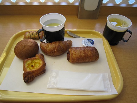6:35 朝食 朝食は、置いてあったパンを5つの全種類取って、飲物はオレンジジュースとコーンスープ。 前回は、ゲートオープンが7時と聞いていたので、出発が早く朝食を食べそびれましたが、実際のゲートオープンは7時半で朝食を食べる時間がありました。 とりあえず、無料なので、ちゃんと食べます。 パンは焼きたてで美味しいね。 |
