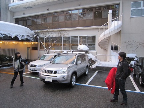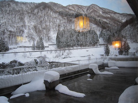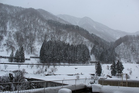 朝起きてホテルの窓から外を眺めると、雪が深々と降っています。