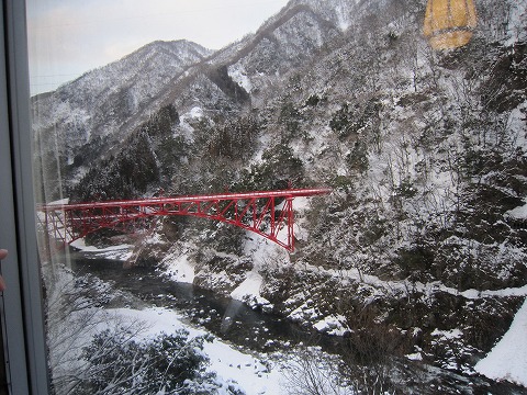 17:03 部屋から ホテルの部屋は全室、黒部川向き。 今回はトロッコ電車の赤い橋が見える部屋です。 モノクロームの雪景色の中、深紅の橋のコントラストが好きです。 それでは、夕食は遅めの7時からをお願いして、ゆっくりと温泉に浸ることにします。 |