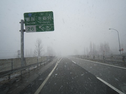 12:45 雪 上越ジャンクションから北陸道に入り、糸魚川を過ぎ富山県の県境を過ぎる頃から雪が降ってきました。 前回来たときに泊まった宇奈月温泉が近い黒部インターを通過することには吹雪に。 ここまでの距離は自宅から400kmを越えて 422.9km、所要時間6時間46分。 目的のインターまではもう少し、安全運転で行きましょう。 |