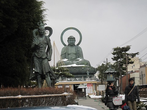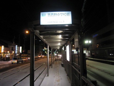 18:53 路面電車で 宿に戻って駐車場にハイエースを駐め、出かける前にひとっ風呂。 宿から雪が積もる道をてくてく歩いて、路面電車の停車場までやってきました。 ここ高岡市は富山市と同じように路面電車が走っています。 路面電車は高岡の駅前から隣の射水市の海王丸が停泊している富山新港を結んでいます。 高岡行きの路面電車はこの時間1時間に4本。 電車は行ったばかりで、次の電車まで、約15分ほど待ちます。 『さっ寒い! (ToT)』 |