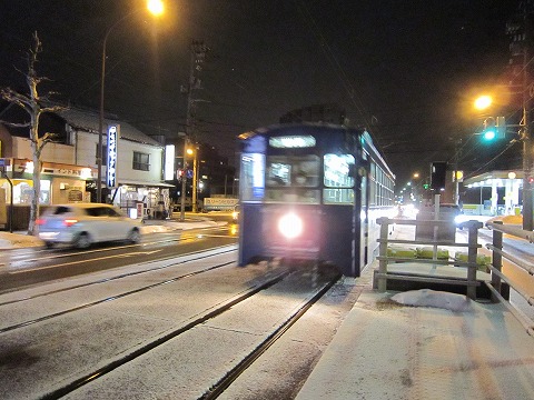 19:00 来た! しばらく待って、路面電車がやって来ました。 写真的には風情があるかもしれないけど、寒いです。 |