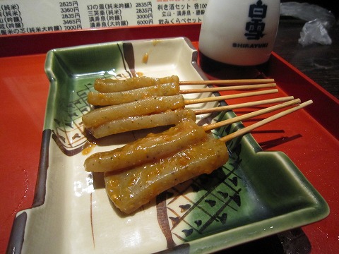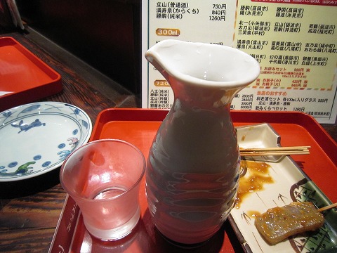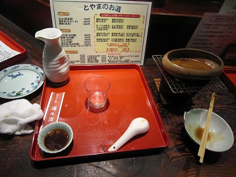 19:52 勝鬨(かちどき) そして、カウンターの上の鍋で暖められていた、”味噌おでん”を取り分けてもらいます。 その後ろには、いつの間にかとっくりが!(汗) 利き酒セットが終わり、勝駒の他のもう一つの高岡の酒蔵のお酒”勝鬨”. こちらはさらりと飲みやすいお酒ですかね。 イマイチ記憶が薄い。 |