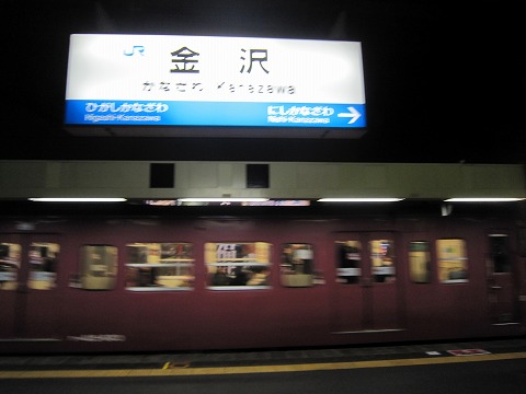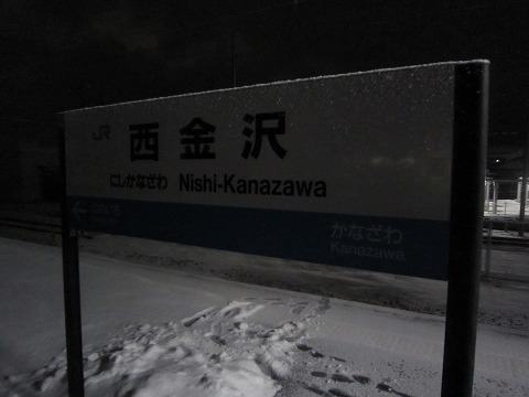 19:36 西金沢駅 金沢駅から3分、西金沢駅に到着しました。 駅名看板を探して、プラットホームの端まで。 ホームには列車に乗ったお客さんの足跡だけが残り、だれも居ないよ。 真っ暗です。(笑) 駅までは清水さんに迎えにきてもらって、押しかけることにします。 |
