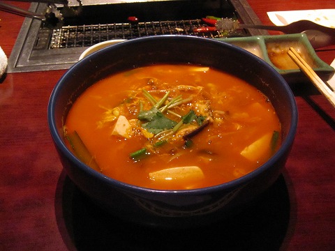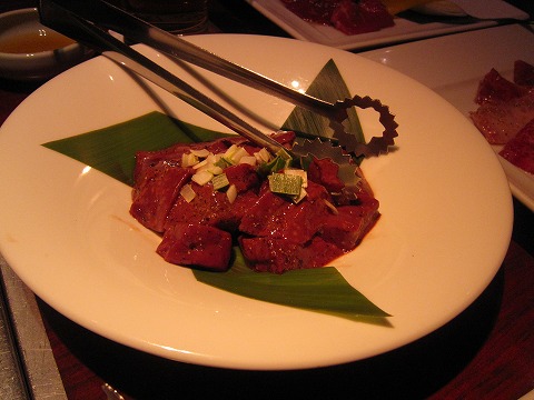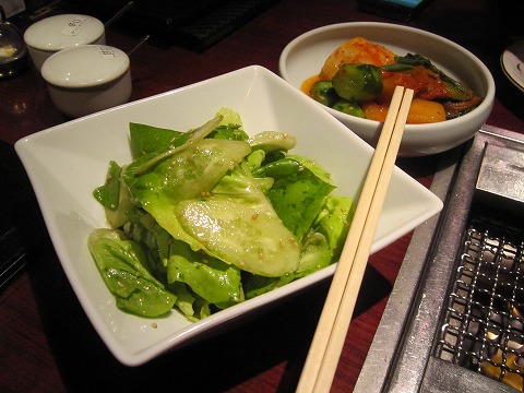 17:26 まずは ビールで乾杯したあと、まずは野菜である。 食物繊維を先に食べると、太りにくいらしい。 (^_^;) が、これからガッツリ肉を食べようとするには、「往生際が悪い。」と言うものだ。(笑) 叙々苑のキムチは、辛味が押さえてあって甘みが強く、タイ料理を食べ慣れた自分には、少々辛味不足である。 |
