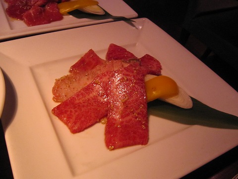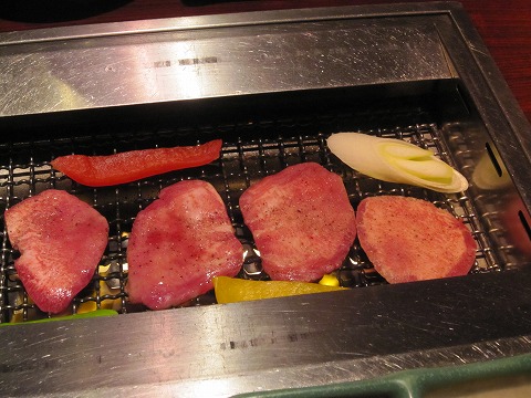 17:26 そして肉 そして、肉に。 定番のタン塩である。 最近、厚切りのタン塩が出回っているなか、スタンダードとも言える薄切りである。 タン塩には高級感を醸し出すため花が添えられている。 こう言った気遣いが女性には嬉しいのであろう。 が、自分には食べられないものは不要である。(爆) |