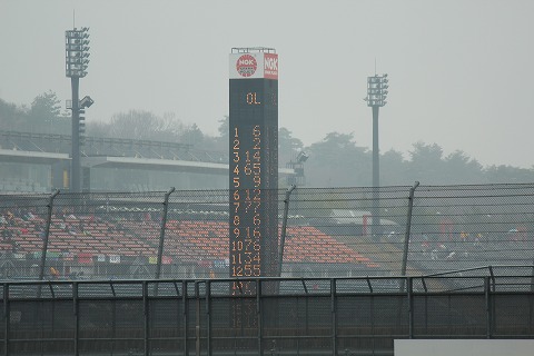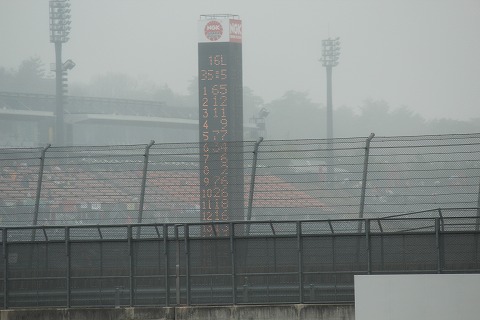 12:23 フィニッシュ! 16周にわたるST600クラスの決勝が終了しました。 ダウンヒルの観客席から見るリーディングボードは小雨に霞んだままでした。 |