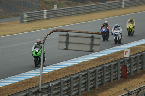 11:49 決勝スタート ST600クラスの決勝レースがスタートし、マシン次々とがダウンヒルストレートを下ってきました。 トップは既に通過した#65チャランポン・ポラマイ選手。 続いて、2番手に付ける#77はベテランの井筒選手。 それにポールポジションスタートの#6の渡辺選手、#12の大崎、#9稲垣選手が続きます。 |