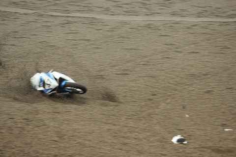 11:49 荒れる? と、ダウンヒルの立ち上がりで転倒している手前、ダウンヒルの入り口でもう一台転倒。 荒れたレースになりそうです。 このマシンはコースの外に出たので大丈夫そうですが、前の写真のマシンは転倒してコース上に残されました。 撤去作業に手間取るようでしたら、赤旗中断でリスタートの可能性もありましたが、トップグループが2周目を戻ってくるまでには、撤去作業は終わりレースは継続です。 |