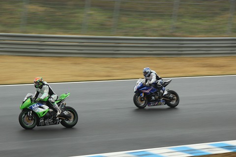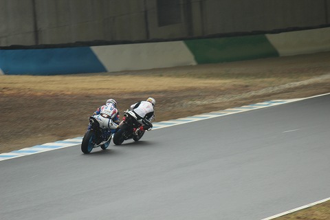 12:14 あああっっっ! #77の井筒選手はブレーキングが遅れてマシンをバンクできず、ダウンヒルコーナーを真っ直ぐに。 (>_<) その右側を#65チャランポン選手が抜いて行きます。(残念) |