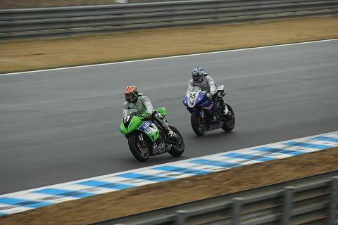 12:14 突っ込みで 12周目。 トップ争いを続ける#77井筒選手と#65チャランポン選手。 ダウンヒルコーナーの突っ込みでハードブレーキング。 レートブレーキングでマシンをイン側に寄せられない井筒選手のイン側に付けるチャランポン選手。 |