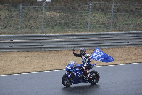 16:09 レース終了 16周にわたるJSBのレースが終了しました。 結局レース中は雨が止むことは一時もありませんでした。 気温も5℃、路面温度も10℃程度で寒さの中でのレースでした。 |
