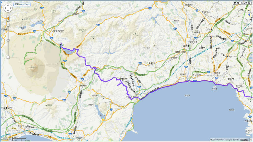 10:51 明神峠を越えると 誓いの鐘から県道365号朝柄峠線を下り小山町の市街地へ。 小山町からは静岡県道147号山中湖小山線に入り、山中湖方面を目指します。 県道147号線に入り、明神峠〜県境の三国峠を越えると県道は静岡県から山梨県の県道730号線に変わり、目の前には富士山と山中湖が見えてきます。 今日一番の写真スポット。 ここで写真を撮らないわけはありません。 路肩にR1を駐めて写真を撮影。 辺りの山は山焼きをした直後らしく、山腹は黒い地肌を見せています。 山中湖の遠く向こうには、山頂付近に残雪が残る北アルプスを望むことができます。 |
