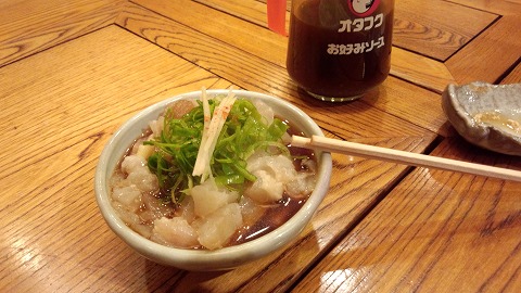 20:37 注文は 注文は、お好み焼きが”肉玉のそば入り”。 そばの代わりに”うどん”も選べ、自分は知りませんでしたが、広島では意外にポピュラーなようです。 そしてお好み焼きが出来上がるまで、少し時間がかかるだろうと、ビールのアテに黒板に書いてあった”スジの煮込み”も注文。 ちょっと待って、スジの煮込みが出てきました。 これをアテにして、ビールを飲んで待つことにします。 (^o^) |