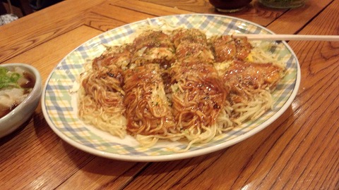 20:37 お好み焼き スジの煮込みが出てきたとおもったら、すぐにお好み焼きが出てきました。 お好み焼きはお皿に載って運ばれてきました。 他のテーブルの地元らしきお客さんは、テーブルの鉄板で、しかもヘラを使って食べていますね。 ヘラで食べ慣れていないので、お好み焼き文化圏じゃない自分には、この方が助かります。 ここのお店のお好み焼きは、見た目がイメージとかなり違いましたね。 (広島の)お好み焼きって、オタフクソースがべったり塗ってあって、真っ黒というか、真っ茶々なイメージがあったんですが、ここのはソース少なめ。 テーブルの上にはオタフクソースが置いてあるので、味が薄かったらかけてみることにして。 まずは一口、『いただきます!』 「おっ! 美味い。」 確かにソースの味は薄いですが、お好み焼き自身に味がついて(たぶんキャベツの味)美味いです。 |