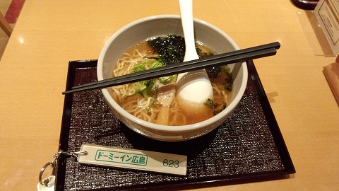 22:36 夜鳴きそば ツーリング先での夕食を、お好み焼き1枚とちょっとしたつまみで引き下がる訳がない、と懸命な読者は思ったことであろう。 お好み焼きの帰りにコンビニに寄ってアルコールを買い込んで部屋呑み。 軽く呑み終わった後、ホテルのレストランに行って”夜鳴きそば”をいただきます。 自分は今まで泊まったことがなくて知らなかったのですが、ドーミーインでは夜食にこの"夜鳴きそば”を無料で食べることができます。 行きに男レーシングさんが教えてくれました。 これを教えてもらったので、お好み焼き一軒であっさりと引き下がった訳です。(笑) この夜鳴きそばもあっさりとして、夜食には美味しい。 ただし、時間が21:30〜23:00までと、本格的に外呑みをすると、この時間にホテルに戻ってくるのはかなり難しい。(笑) |