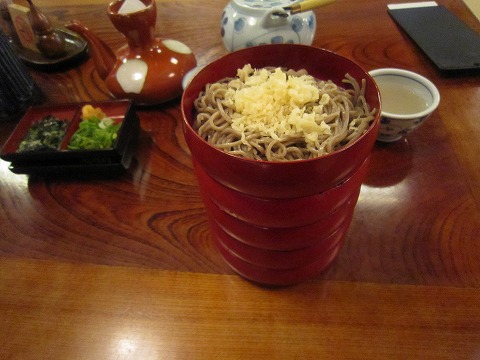 15:07 割子そば 店内は1階と2階があり、自分は1階に通されました。 時間的に、お客さんがちょうど引き始めるタイミングで、待たずに小上がりのテーブルに座ることが出来ました。 注文は出雲そばのスタンダードな食べ方の”割子そば”。 割子の数によって、3代(3段)、4代(4段)、5代(5段)とあって、お願いしたのは言わずもがな。 しばらくして、割子そば5代(¥1,660)が運ばれて来ました。(^o^)/ |