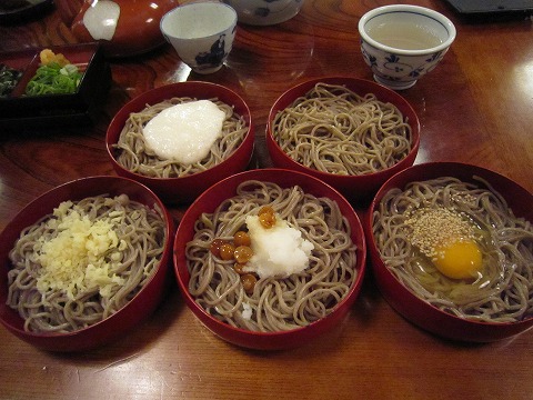 15:08 5代です 5段に重ねられた割子にはそれぞれ違う薬味が載っています。 一つは、何も薬味はなし。 その他は,、山芋、天かす、ナメコおろし、玉子とどれもシンプルで基本的なものです。 まずは、薬味の何も載っていない右上の割子から。 つゆを漬けずにいただきます。 蕎麦は甘皮を一緒に挽いた、田舎そばでしっかりとしたそばの香りがします。 蕎麦自体にあまり期待していなかったのですが期待以上です。美味しいです。 そして、次につゆをかけて。 つゆは蕎麦猪口にいれ蕎麦を漬ける食べ方ではなく、割子に入ったそばに汁を直接かける食べ方。 いわゆる”ぶっかけ”でいただきます。 |