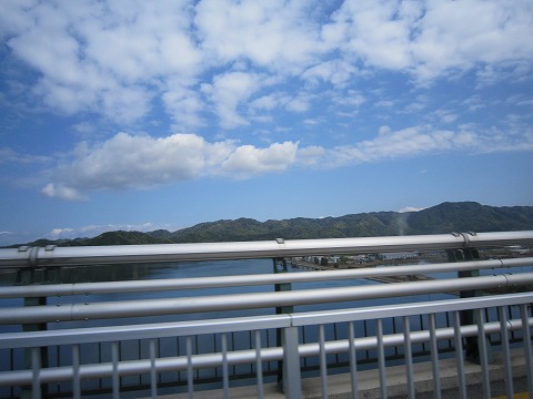 9:08 江島大橋 国道431号線で松江市の美保関まで進み、途中で右折して県道338号美保関八束松江線に入りました。 県道338号線は最初、県道の両側が中海の締切堤防の上を走り、中海にある江島から鳥取県につながる江島大橋を渡ります。 江島大橋の上から写真を撮りましたが、橋の欄干が邪魔して、イマイチの写真になってしまいました。(笑) |