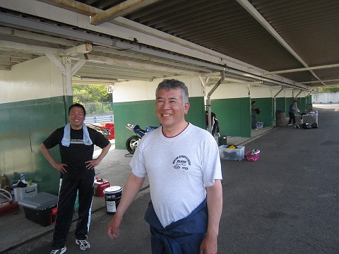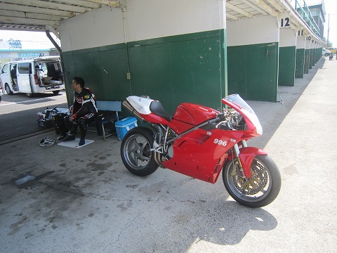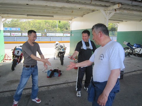 9:12 エンジンは このホームページでも書きましたが、今回シーズンオフに清水さんにお願いしてエンジンを載せ替えました。 新しく積んだエンジンは、少し走っているので、ナラシは要らない様ですが、ライダーが前回のサーキット走行から7ヶ月ぶりなので、まずはライダーの慣らしが必要です。(^Д^) |