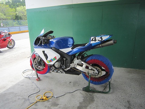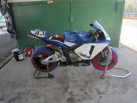 9:11 タイヤの暖まり待ち 走行の準備ができました。 けど、タイヤウォーマーをかけたのが8時半頃だったので、まだタイヤが暖まっていないので、もうちょっと待ちます。(1時間くらいかな) タイヤは昨シーズン7月の筑波TTで降ろしたピレリのユーズドを履いています。 そして、ブレーキフルードも昨シーズンの始めに交換したままなので、フルードも新しく交換。 |