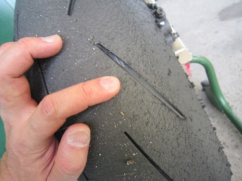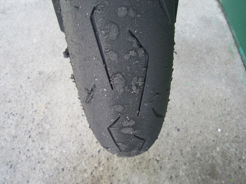 16:18 走行後 走行後のタイヤ。 リヤの右側のバンクからアクセルを開けていく辺りはかなり溝が無くなってます。 けど、ピレリって、減っても結構グリップしちゃうのよね。 フロントもバンクしているところの溝はやっぱり角が落ちちゃってる。 一応、これでこのタイヤは終了ですね。 |