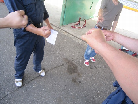 8:49 じゅーじゅんから 走行の準備をしている間に、今日一日の運勢を占う(?)ジュースジャンケン! 「うわぁ! 負け残った!」 |