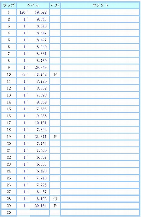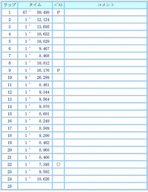 | 模擬レースの結果、 3番グリッドからスタートして、2番手でした。 ベストラップを見ると、3周目にどうにか1分4秒台に入るぐらい。 前回の3秒中は幻だったのか? (^_^;) ピレリのニュータイヤを履いた蛯名さんは成長著しく、自己ベストを2秒縮めて、1分5秒台に。 抜かれる日も近いな・・・。(-_-;) |
