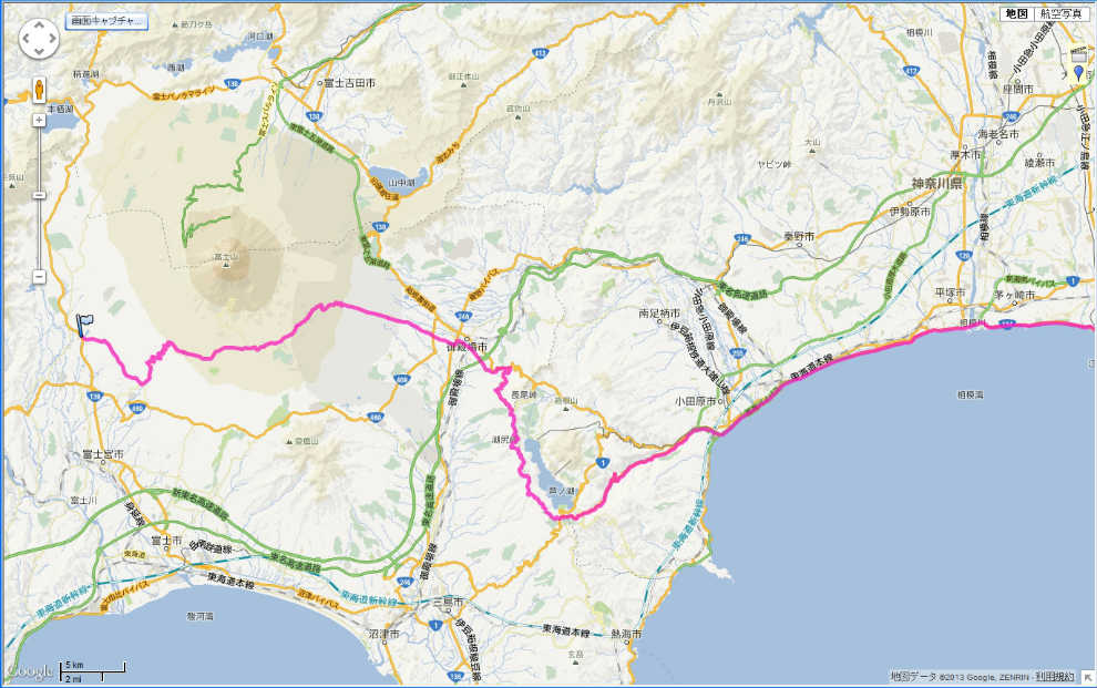 11:19 目的地に到着 水ヶ塚公園で休憩した後、県道152号線を3kmほど西走、新五合目へと向かう交差点で今度は県道180号富士宮富士公園線に入り、西走を続けます。 県道180号線を富士宮に向かい下りのワインディングを抜けると、県道180号線は富士宮の市街地に近づきます。 県道180号線は水ヶ塚公園から富士宮に向かい、下りの中速コーナーが連続するワインディングロードです。 以前来たときは、工事中で一部未舗装の区間がありましたが、今は全面舗装され走りを楽しめる路線となっています。 ただし、両側に生えた木々が高く茂っているため、眺望はのぞめません。 県道180号を西走して、ENEOSのスタンドがある篠塚の交差点まできたら右折し、今度は県道72号富士白糸滝公園線に入り、北西に進路を取り白糸の滝方面をめざします。 県道72号線を進み、白糸スピードランドを越え、国道138号線近くにある今日の目的地、”富士宮やきそば まごころ”に到着しました。 |