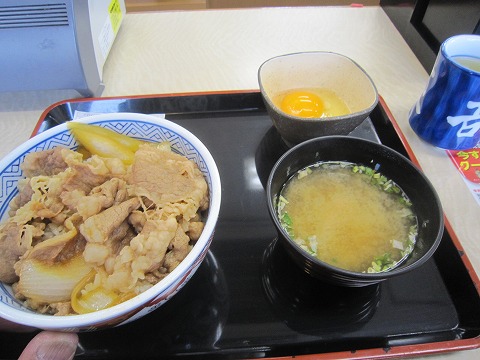 8:24 定番 朝食は定番の牛丼(並)。 玉子、みそ汁付けてね。(笑) 牛丼は¥280の新価格で、ちょっと嬉しい。(^o^) |