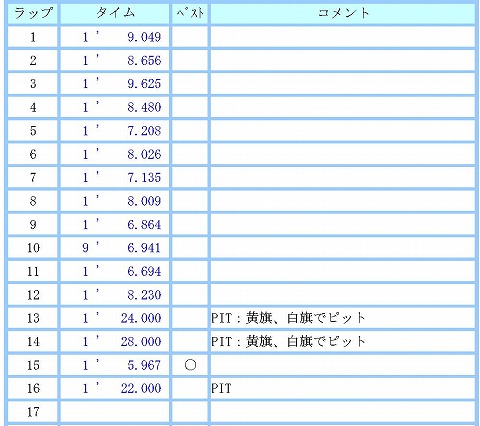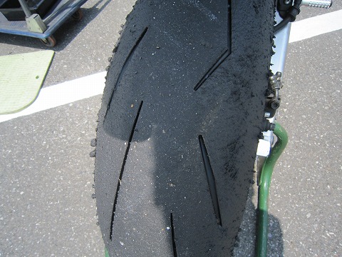 12:47 走行後の 走行後のタイヤ。 上はフロント。 こんなもんでしょう。 もう1日練習走行で使いますよ。 と言うより、ピレリだと耐久性があるので余裕で使えるね。 下はリヤ。 右の立ち上がりでアクセルを開けていくところが、多少ザクってます。 まあ、周回数の多いレースをする訳じゃないので、今のところ問題ないかな。 それよりも、問題はタイムが出てないことだね。(爆) 2本目14周がベストで今日のベスト1分5秒593。 去年の最後に走ったときの0.2秒落ちなので、進歩もなけりゃ、退化もなしかな。(笑) |