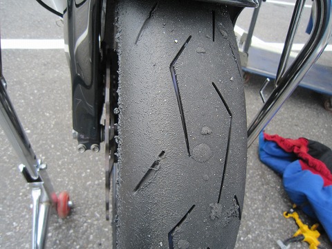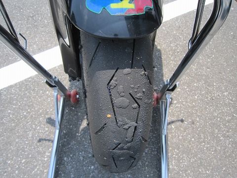 10:49 走行後の なんて、色々確認しながら走っていたら、13周目の1コーナーで前を走る2台が接触! 1台が縦転がりをして転倒。(>_<) 『あっぶねぇ〜。』 で、ちょっとピットロードで待機。 14周目に再度コースインして、15周目にどうにか5秒台に入ったところで、1本目の走行は終了! やっぱり、走行時間20分は短いね。 そして、走行後のタイヤ。 前後ユーズドのSC1(ソフト側) 路面温度が高すぎることもないので、上手く機能して、自分にはまったく問題なし。 と言うか、限界が高すぎて、そこまで使えず。 限界が見えません。 久しぶりの走行でそこまで確認できず。 (^_^;) で、終わってしまいました。 |