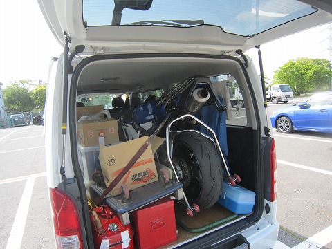 5:41 筑波サーキットに 今日は久しぶりに筑波サーキットに練習に行きます。 前回筑波を走ったのが、去年の10月3日だったので、ほぼ8ヶ月ぶりの練習です。 昨晩仕事から戻ったのが遅く、あたりが暗かったので積み込みはしませんでした。 今日の1本目の走行は10時過ぎからなので、いつもより少しゆっくり出発できることもあり、出発前に積み込みをすることにしました。 まずは、仕事の道具をハイエースから降ろして、バイクを詰める状態に。 |
