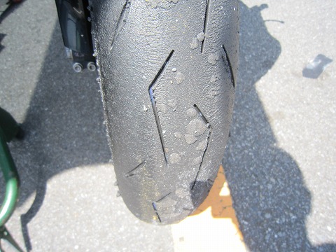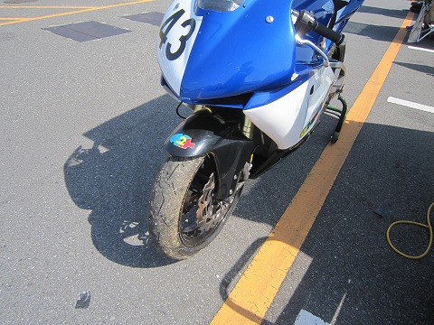 14:37 転倒後の 転倒したバイクはコース上に。 オフィシャルがスポンジバリヤーの後ろ側に片付けて、自分の走行は2周せずに終了。(T-T) 自分はポストで、特スポの時間が終了するのを待って、回収車でパドックへ。 思えば、回収車に乗ったのは、初めてだ! 最終コーナーで転んだときは、押してパドックに戻ったし。 1コーナーで転んだときは、救急車で運ばれた(らしい)ので、バイクはオフィシャルが回収したし。 S字で転んだときは、これまたオフィシャルが押してパドックに戻ったし。 去年の筑波TTで撃墜されたときも、バイクを押してパドックにもどっているんだね。 走行後のタイヤ。 じゃなくて、転倒後のマシン。(ToT) タイヤは芝生だらけだ!(爆) |