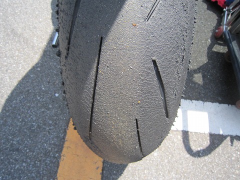 12:30 走行後の 走行後のタイヤ。 前回に引き続き前後ユーズドのSC1(ソフト側) リヤの右、立ち上がりでアクセルを開けていく所は、ちょっとザクザクになりかけているかな。 でも、問題ないでしょう。 まだ溝もあるけど、滑る気配なし。 ピレリは価格はBSやDUNLOPと比べてやや高いですが、ライフが長いので、トータルの出費が抑えられるので、ユーザーとしては助かりますよね。 このピレリタイヤも、新型が出て、このタイヤが公認で使えるのは今年の11月まで。 ピレリの後継のタイヤは、MFJの申請を行わず、代わりにメッツェラーを公認申請しました。 このメッツェラーの公認は6月1日の明日から。 なので、使おうと思えば明日の筑波TTから使えますよ。(笑) まあ、全日本ではいきなりメッツェラーを使う有力チームは出てこないでしょうから、しばらく様子見でしょうね。 |
