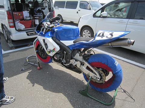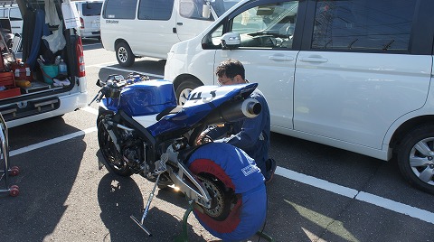 7:17 準備 ハイエースからマシンを降ろして、準備をします。 まずは、タイヤウォーマー。 タイヤは昨日のうちに交換しておいたので、エアーをチェックしてウォーマーをまくだけ。 |