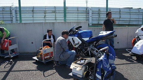 8:38 ウォーミングアップエリアへ 車検が終わったら、ウォーミングアップエリアに移動。 エンジンの暖機をして、この時点でオイル漏れが無いかを確認。 そして、アンダーカウルを取り付け、マシンの準備はOK! 壁際にへばり付いているのは、今日手伝いに来てくれた996のエビナさん。 |