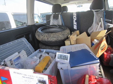 8:49 走行前 マシンの準備が終わったら、マシンはそのままウォーミングアップエリアに置いて、自分だけハイエースに戻って来ました。 ここでツナギに着替えて、パドックに戻ります。 ライディングをするのに、まずはインナーを着て、ツナギを着て、脊椎パッドを付けて、ブーツを履いて、ブレストガードを付けて、なんてしていると5分くらいはすぐにかかっちゃいます。 ちなみに、ハイエースの車内に放置された昨日転倒して芝生がみっちり付着したタイヤが痛々しい。(笑) |