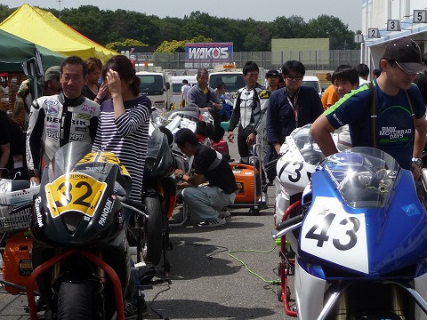 9:33 パドックに並ぶ ツナギに着替えた後、ふたたびウォームアップエリアへ。 そして、前のクラスがコースインするタイミングを見計らって、パドックのNMクラスの列に並びます。 今日の予選は前の方には並びません。 まず最初の3周は慣熟走行。 昨日転倒してから、確認の走行をしていません。 まず最初の3周で、昨日出たエンジンが失火するトラブルが出ないかを確認。 次に、オイル漏れが無いかを確認したあと、タイムアタックをします。 ただ、前回にするとジェネレーターカバが割れてオイルが漏れる可能性があるので、タイムアタック3周したら、ピットに入ってマシンチェックをする作戦です。 |