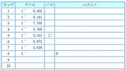 コースインして、1〜3周目までは、少し抑えて、マシンチェック。 4周目からタイムアタック。 4周目5秒7 昨日のマシントラブルの影響でちょっとビビリ気味。 (-_-) なんとか自己ベストに近い4秒台には入れたいところですが・・・。(汗) 5周目5秒315。 4秒に入らないね。 (~_~;) 6周目、前が詰まってタイムが出せず。 ここで、予定の3周のマシンチェックと3周のタイムアタックが終わり。 でも、6周目前に引っかかっちゃったから、もう1周だけタイムアタック。 で、タイム更新出来ず。(-_-;) あきらめ悪く、いくらやっても、切りが無いので、ここでピットインします。 |