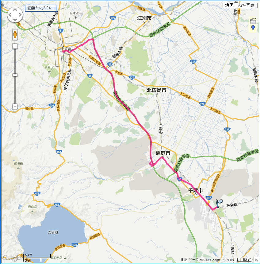 国道36号線に突き当たったら、右折して札幌、千歳市街方面に向かいます。