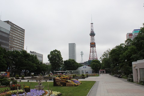 6:58 大通り公園と札幌テレビ塔 すすきのにあるホテルを出て北上。 大通り公園までやってきました。 大通り公園には札幌のシンボルの一つ”さっぽろテレビ塔”。 150m弱の高さで、今となってはあまり高く感じなくなったね。 大通り公園は、冬になると”さっぽろ雪祭り”が開催されることで有名。 今は、日中花の展覧会をやっているようです。 |