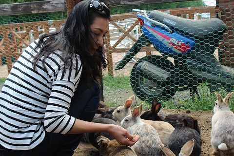 13:04 うさぎに興奮 ここでは、うさぎのエサが売っています。 それを買って、勝手に(自由に)ケージの中に入ってエサやり。 たくさんのうさぎに囲まれて嫁さんは興奮気味。 ひつじの丘のスタッフはエサやりの手間が省けてイイね。(笑) |