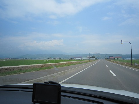 12:40 道道705号 北海道道759号線を進み、中富良野で国道237号線に突き当たり、今度は道道705号ベベルイ中富良野停車場線に入り、引き続き南東にクルマを走らせます。 この真っ直ぐな道は北海道ならでは、本州ではなかなか出会うことがありませんね。 晴れていれば目の前に十勝岳連峰が見えますが、今日は雲が多くうっすらとしか見ることができません。 |