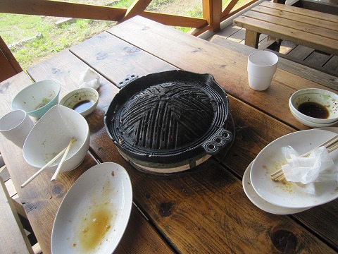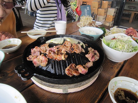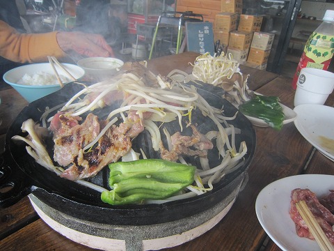 13:31 焼く ラム肉を2人前、野菜焼きを2人前、サラダを1人前注文。 早速、ラム肉を焼きます。 (^_^)v 肉を漬け込んだタレが焦げて、甘い匂いが漂います。 思わず、『じゅるっ!』とよだれが出そう。 ここで、嫁さんは野菜を肉と同じ鍋(鉄板?)で焼くのが嫌だ! と離脱。 (昼飯抜きだね) |
