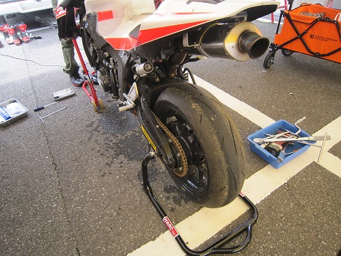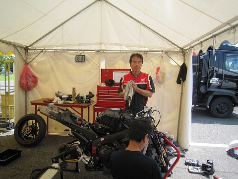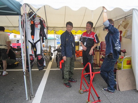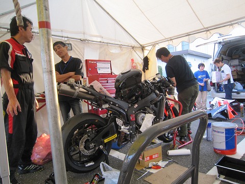 15:11 直ったよ 修理が完了して、マシンはインフィールドのパドックへ。 清水メカも自分らヘルパーも一段落。 後はライダーにガンバってもらいましょう。 |