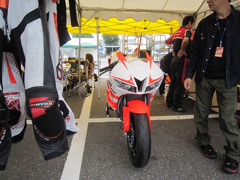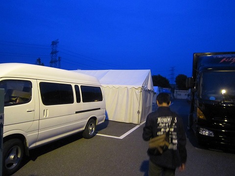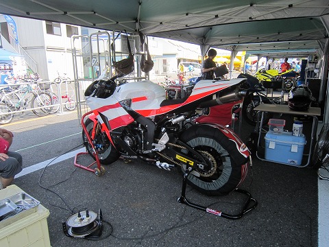 7:38 まずは 途中のホテルで合流して、筑波サーキットまでやってきました。 まずは駐車場に設営されたテントで、マシンの準備をします。 |
